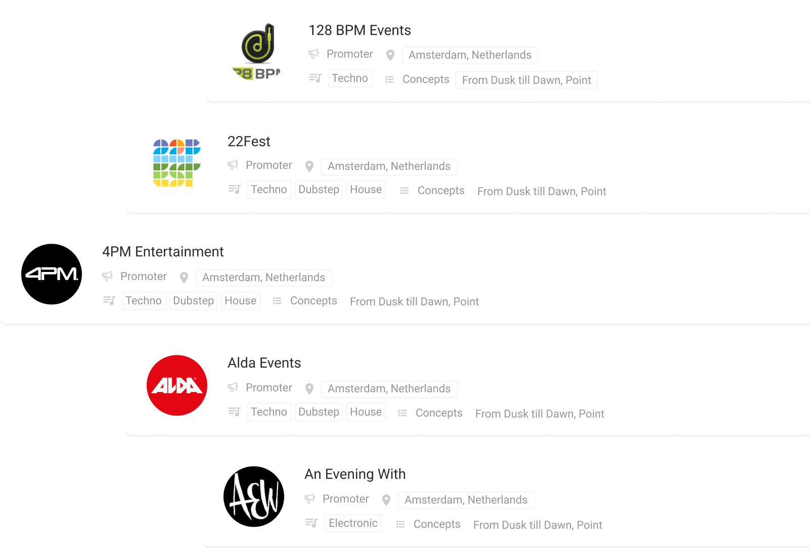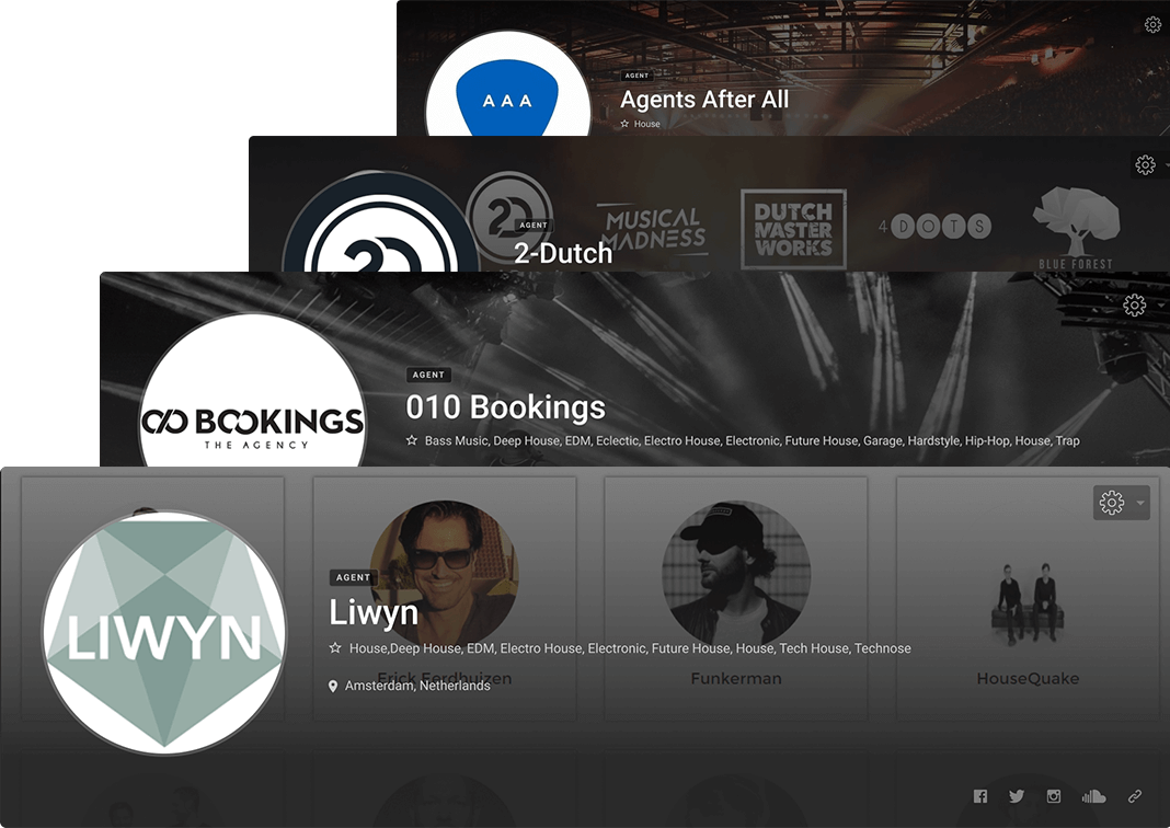As all Bookya profiles are dynamically linked, making your Agency profile always up to date in terms of your roster and their agenda’s. We’re pretty confident we have your profile stored already, we identified over 1300 Booking Agencies, purely focused on Electronic Music.